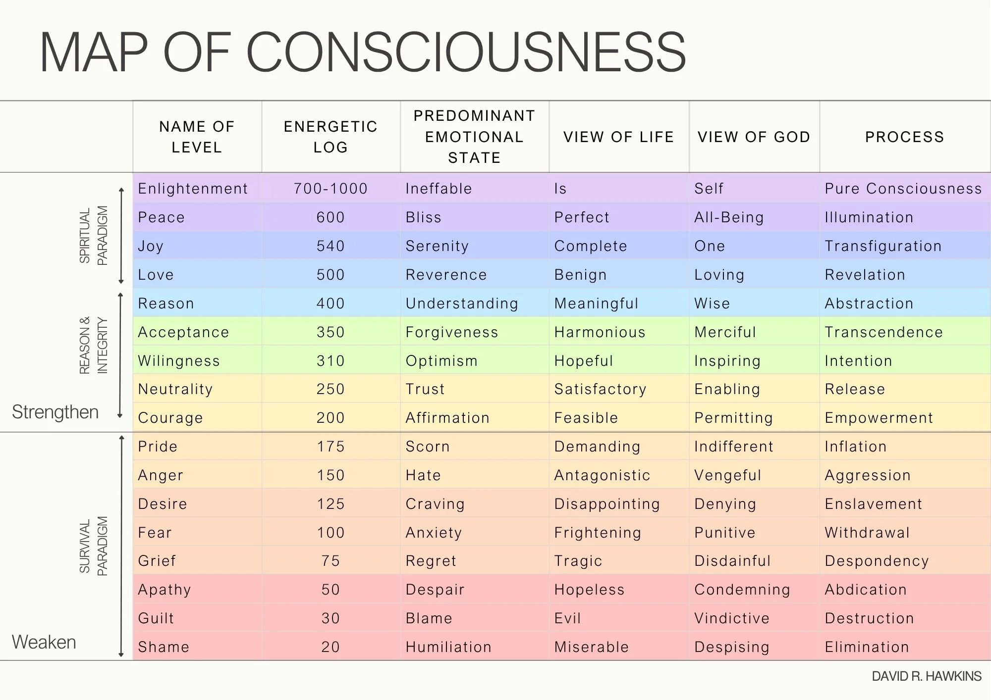 The Map of Consciousness, developed by Dr. David Hawkins in, is a logarithmic scale measuring human consciousness from 20 to 1000, with each level representing different emotional and energetic states. The scale helps us understand that emotions aren't just feelings - they're actual frequencies of energy that either expand or contract our awareness and life force. By learning to identify where we are on this scale moment-to-moment, we can consciously choose to move toward higher energy states (like courage at 200, acceptance at 350, or love at 500) and away from lower ones (like shame at 20, fear at 100, or anger at 150). This framework is particularly powerful for burnt-out professionals and students because it reframes energy management as the practice of moving up the emotional scale throughout your day, helping you preserve creative energy after work hours.